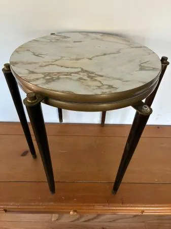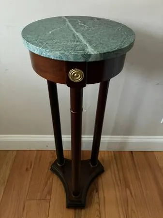 LIKE NEW - Regency Style Table Pedestal Plant Stand Marble Top Mahogany and Brass accents. 31 5/8 Tall x 11 Diameter green marble top. The Bombay Company Sturdy and solid. I live close to south county mall in Oakville. I prefer text or call please, thank you.