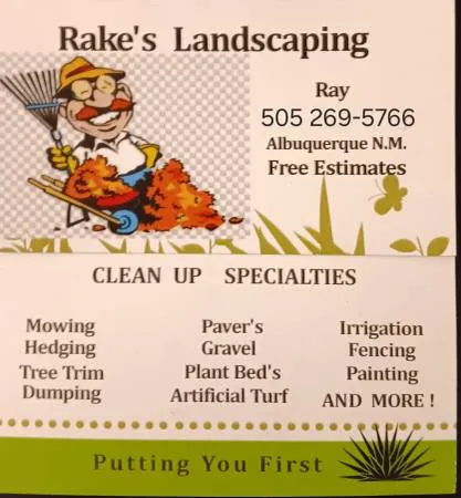 R A K E S L A N D S C A P I N G CALL 📞 TEXT 📲 RAY (5 0 5) 2 6 9 - 5 7 6 6 FREE ESTIMATES !!! YARD CLEANUP AND MORE !!! All SEASONS SPECIALS ! GOT 🍃 LEAVES , WEEDS 🌾 CALL US. AFFORDABLE, HONEST, RELIABLE, SERVICE WITH A SMILE 😃 !!! PULLING WEEDS 🌾 BY HANDS 🤲 and MUSCLES 💪 RETAINING WALLS , BLOCK WALLS KEYSTONE BLOCK, AND REPAIRS . LAWN MOWING , HEDGING BUSHES . 🌳 TREE TRIM &CUTTING , PAVERS , GRAVEL , WEED CONTROL SPRAY AVAILABLE 🪴 PLANT BEDS 🛌 , ARTIFICIAL TURF, SPRINKLER REPAIR , FENCING , PAINTING 🏠 HOUSE PAINTING & STUCCO REPAIRS , MOVING FURNITURE 5×10 DUMP TRAILER & 7 × 20 FLATBED TRAILER HAULING SERVICES JUNK REMOVAL , POWER WASHING , DRIVE WAYS , BUILDING , SHEDS , ETC. WOODCUTTING , LOG SPLINTING. 🔥 FIREWOOD. AND MUCH. MORE!!!! ( FREE ESTIMATES ) 📞 CALL OR 📲 TEXT ME 🤔 SI HABLO ESPAÑOL (505) 2 6 9 - 5 7 6 6 RAY