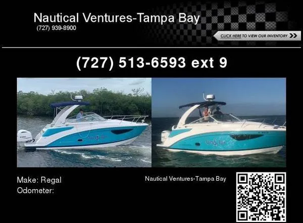 Nautical Ventures-Tampa Bay address: 1925 US HWY 19 Holiday FL, 34691 phone: 727-513-6593 ext 9 text: Text 9 to 727-513-6593 for more details : https://www.boattrader.com/boat/9942795 contact: Nautical Ventures 2021 REGAL 26 XO Boat Info Stock #: Jerry Lewis Hull ID: RGMHP 153 B 121 Condition: Used Boat Details Hull Material: Fiberglass Propulsion Type: Express Cruiser Engine Type: Single Outboard Engine Size: 300 Engine Description: Yamaha F 300 NCA 2 Engine Hours: 114 Fuel Type: Gas Measurements Length: 27.08 Beam: 8.5 Description Available by Appointment: Tampa Bay - HIN: RGMHP 153 B 121 Regal 26 XO Yamaha 300 Hp 114 Hours! Engineered for ultimate versatility. Handcrafted with attention to every experience-enhancing detail. The Regal 26 XO is a refined cruiser that meets an elevated standard of excellence. With a wide variety of amenities available both above deck and below, this boat is designed to keep you-and your guests-feeling comfortable, relaxed and refreshed all day long. Lay down the backrest, get comfortable and soak in the rays on the large multi-position sunlounge. You can comfortably seat 5 in the face-to-face seating and enjoy spending time with those that love being on the water as much as you do. Regals uniquely shaped salon provides the most-in-class space with an expansive seating layout and berth for overnight stays. The cabins galley features an electric stove and refrigerator, a stainless steel sink and plenty of storage for everything you need to entertain your guests. Nautical Ventures-Tampa Bay address: 1925 US HWY 19 Holiday FL, 34691 phone: 727-513-6593 ext 9 text: Text 9 to 727-513-6593 for more details : https://www.boattrader.com/boat/9942795 contact: Nautical Ventures