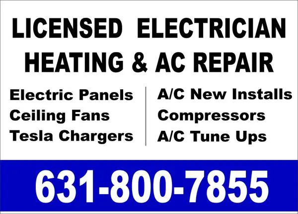 I have 15 Years of Electrician and HVAC Heating & Air Conditioning Technician experience. I am licensed and insured and can trouble shoot and fix any type of problem you may be having in your home or office. I am h 1 st and affordable and can usually do SAME DAY SERVICE CALLS! I do not carry the overhead of a lot of these electricians and HVAC companies, so I can typically save you 20 to 50 on whatever type of work you need d 1. Call me at 631-800-7855 Electrician Work I do 220 Installs Ceiling Fan installs Recessed Lighting Security Lights Tesla Chargers Electric Vehicle Chargers EV Chargers Car Chargers GFCI Installs Hot water heater hookups Outlets Switches Plugs And everything else electrical Call me at 631-800-7855 Heating & Air Conditioning Work I do AC Repair A/C Repairs Air Conditi 1 r Heating Furnace Repair Heat Pump Services Geothermal Heat Pump Installation Boiler Repair Carbon Monoxide Testing Blue Track by Thermo King Tractor Trailer / Box Truck Carrier Chiller Repair Humidifiers Dehumidifiers Air Filtration Air Cleaners Gas Fireplaces Duct Cleaning Ductless Mini-Split Systems Oil to Gas Conversions Aeroseal Duct Sealing Home Energy Audits HVAC Replacement HVAC Repair HVAC Maintenance Fan Coils & Air Handlers and everything else heating & air conditioning related Call me at 631-800-7855 Call me and you can rest assure that Ive probably seen your problem and fixed it many times before. Call me today at 631-800-7855 . . . . . . . . Keywords: Electric Electrican Electricians Electricans elctrician elctricians eletrician elecrtician eletrician electrial electrian Electricista elecctrician Electrcian