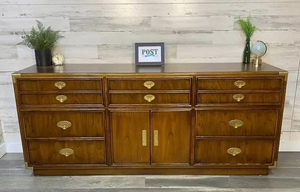 Restored Lexington vintage dresser. This amazing piece is solid built with pecan wood, making this a very heavy and sturdy piece. Campaign style Brass hardware and edge detail really make it pop! Like new condition! Width - 70.5 Depth - 19 H 8 - 30.5 Price-$795 located in Canby no holds purchase directly from our website www.postfurnishings.com txt 541-490-6212 Lexington dresser, dresser, mid century dresser, long dresser, buffet, postfurnishings