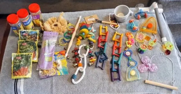 Bird cage ACCESSORIES Some things are NEW The food and things in a container are not full ... Food etc Colorful swings and ladders Bells and fun stuff All you need is the bird and a cage 🐦 Text 480-410-7441