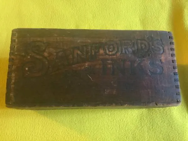 I have for sale 1 Vintage Sanford Ink Dovetail Wood Box. This is in used and vintage conditions. It says Sanford Ink 23 on front and back. On the sides it says 30 oz. Sanford Library Paste Chicago & New York. This box measures 121/4 in long by 63/8 in wide by 51/2 in deep. If interested please call Travis at 160-836-1825. thank you for looking. $20