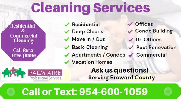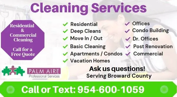 Need a cleaning NOW? Need cleaning tomorrow? This week? We are available! Call me any time and I am sure we will make it happen. Hope to hear from you soon. Thanks RUDY! Call or Text 954-600-1059 Areas we cover! Coconut Creek, Coral Springs, Davie, Margate, North Lauderdale, Deerfield, Lauderdale by The Sea, Sunrise, Tamarac, Davie, Cooper City, Dania Beach, Hollywood, and more. Introductory Rate: $115 - 3 Hours Cleaning $135 - 4 Hours Cleaning $165 - 5 Hours Cleaning $185 - 6 Hours Cleaning We have available during the week and also the weekend! Call me or Text me. Morning Shifts, Afternoon Shifts available too! Need a cleaning after 4 pm? We are ready! We know you may need help at hours that work for you! Let us know! We have a team of Amazing Ladies with several years of experience. Please call or text today at your convenience for a free quote. Call or Text 954-600-1059 I will come in person or handle the quote by phone. Introductory Rate: $115 - 3 Hours Cleaning $135 - 4 Hours Cleaning $165 - 5 Hours Cleaning $185 - 6 Hours Cleaning FIND US ON TIKTOK 🎥 https://www.tiktok.com/@palmairecleaning?_t=8 n 91 zdJqJA 3 r=1 You decide how much time you need.... As long as we have time we will clean it.. Laundry, Cleaning, Windows, Inside Refrigerators, and Organizing as long as we have time we will do it.No Ladders Cleaning is dreadful, we are ready to help. We have space for Saturday and Sunday! We have a team of qualified cleaners who are ready to come and clean your home today! Call now, 954-600-1059 We speak English and Spanish Boca and Hollywood, we have arrived! We are ready for Boca Raton! Need our help, simply call and we will arrive. Pompano Beach, Lauderdale by The Sea, Fort Lauderdale, Galt Ocean Mile, Oakland Park, Deerfield, Plantation, Coconut Creek, Coral Springs, Margate, Sunrise, Dania Beach, Tamarac, Lighthouse Point, Hollywood We are expanding into Hollywood and Hallandale! Get Ready Call today to get a quote! We are licensed and insured. Residential Cleaning Move In/Out Deep Cleaning Basic Cleaning Apartments Family Homes Seasonal Cleaning keywords: housecleaning, commercial cleaning, maid, housekeeper, housekeeping house cleaner, maid, house keeping, apartment cleaning cleaner condo cleaning, warehouse cleaning, commercial cleaning, restaurant cleaning, deep cleaning, carpet cleaning, sofa cleaning, couch cleaning, mattress cleaning, bathroom cleaning, kitchen cleaning keywords: housecleaning, commercial cleaning, maid, housekeeper, housekeeping house cleaner, maid, house keeping, apartment cleaning cleaner condo cleaning, warehouse cleaning, commercial cleaning, restaurant cleaning, deep cleaning, carpet cleaning, sofa cleaning, couch cleaning, mattress cleaning, bathroom cleaning, kitchen cleaning