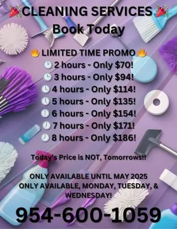 🤩🧼**DISCOUNT ALERT** 🤩🧼 2 Hours - $70 3 Hours - $94 4 Hours - $114 5 Hours - $135 6 Hours - $154 7 Hours - $171 8 Hours - $186 Only Available Monday, Tuesday and Wednesday until the end of May! Other restrictions may apply!! Are you tired of wasting time on cleaning instead of enjoying your free moments? Do you need help with move-in/move-out cleaning or a deep clean? Are you working with a cleaning company that isnt meeting your expectations? Why wait? 📞 Call NOW at 954-600-1059 and get your FREE quote! 📞 We are here to offer you exceptional cleaning services ✨ Give Your Space the Shine It Deserves! ✨ 🚀 Why Choose Us? 🚘Service throughout Broward County and surrounding areas: From West Palm Beach to Aventura, we go wherever you need us! ⏰ Flexible Scheduling: Do you need a cleaning tomorrow? No problem! We work with your schedule. 5 Years of experience 📄Licensed, bonded, and insured professionals 💯Free cleaning estimates 🕐Time-tested techniques 🧹Specialized cleaning products ♻️Eco-friendly products 💻Advanced technology 🦮Pet-friendly and kid-friendly practices 100 Satisfaction Guaranteed ✨ What We Offer: 🧹Customized Home Cleaning: We tailor our services to your needs. 🧹Office Cleaning: We work Daily, Weekly, Biweekly, and Monthly. 🧹Condominium and Country Club Cleaning: Keeping your space immaculate for its occupants. 🧹Move-In/Out Cleaning: We make your transition easy and stress-free. 🧹Additional Services: From laundry to window cleaning and organizing, we handle it all! 🔥 Don’t wait any longer! Our friendly team is ready to help you with a smile. 👉 Call or text 954-600-1059 NOW! Get your FREE quote and let us transform your home. 🌊 We are expanding into Hollywood and Hallandale. Be among the first to enjoy our services! 🧼 Residential Cleaning | Move In/Out | Deep Cleaning | Seasonal Cleaning | Apartments | Homes 🧼 📲 Follow Us: on TikTok! 🎥 @palmairecleaning on Facebook! 👥 Brilliant Cleaning Palm Aire: Tips & Services on Instagram 📷 @cleaningservicessouthflorida For cleaning tips and a glimpse of our team. ✨ Make your home a shining place—call us today! ✨ keywords: housecleaning, commercial cleaning, maid, housekeeper, housekeeping house cleaner, maid, house keeping, apartment cleaning cleaner condo cleaning, warehouse cleaning, commercial cleaning, restaurant cleaning, deep cleaning, carpet cleaning, sofa cleaning, couch cleaning, mattress cleaning, bathroom cleaning, kitchen cleaning keywords: housecleaning, commercial cleaning, maid, housekeeper, housekeeping house cleaner, maid, house keeping, apartment cleaning cleaner condo cleaning, warehouse cleaning, commercial cleaning, restaurant cleaning, deep cleaning, carpet cleaning, sofa cleaning, couch cleaning, mattress cleaning, bathroom cleaning, kitchen cleaning