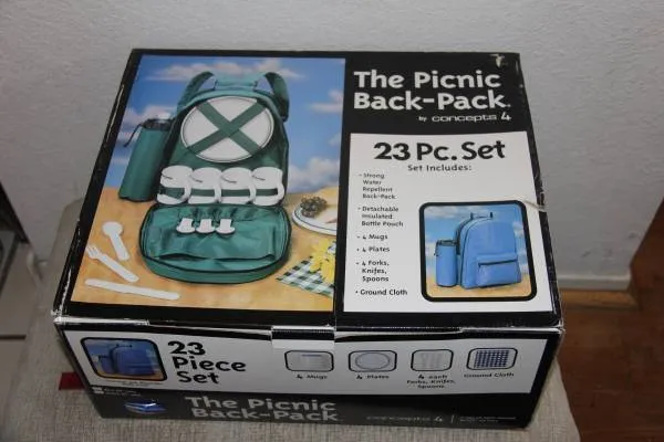 BRAND NEW BEAUTIFUL PICNIC BACKPACK 23 PC SET included 4 plates, 4 mugs, 4 sets of forks, knives and spoons and a beautiful ground cloth. Paid for $49.99 price tag is still on the original box, never use, selling for $15. If interested, please call 408-437-2425 or call/text 408-390-4916. Thank you!