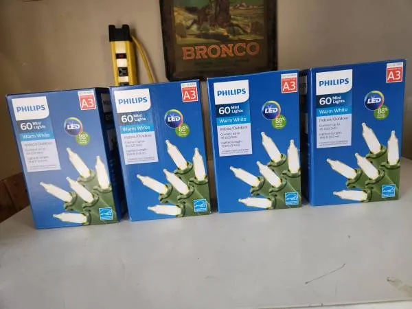 This is a Bundle of 4 Boxes of Warm White LED Indoor/Outdoor Lights Made By PHILIPS and They are Unopened and Brand New. Each Box Contains 119.6 Foot Strand, So You Can Fasten Them Together to Form 1 Long Strand. Each Strand Has 60 Lights Per Strand, So All Connected You Would Have 240 Warm White Lights to Enjoy. The Product Number is A 3 and These Retailed for $12 per Box. These are LED and Energy Star and are Available for Immediate PurchaseAll Together 4 BOXESAs a Bundle and Priced to Sell Quickly. Again, These are Brand New, Unopened Items and This is a Great Deal for $20 For All 4 New Boxes! To View/Purchase Contact Sara @ 541-610-4633 OR Isaiah @ 541-848-8144. Call/TEXT or email Are All Good With TEXT Being Fastest and Preferred. We are Centrally Located in SE PortlandMill ParkJust 5 Minutes East of I 205 Freeway. Pick Up is Simple and We are Very Easy to Coordinate with. These Brand New Warm White Lights Will Not Last Long-Contact Us Today! NO HOLDS, LOCAL, IN PERSON, CASH ONLY SALES PLEASE!!!