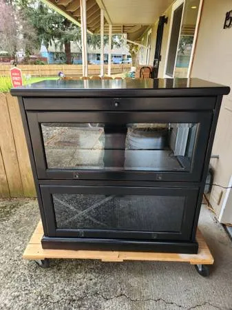 On Offer is This Unique, Wood, Free Standing Pottery Barn Lighted/Mirrored Bar Cabinet and It is in Excellent Condition with Some Very Minimal Wear! It Features 1 Small Pull Out Drawer,2 Beveled GlassLawyers Case Style Cabinetswith Lighted Interior Shelf Space for Your Favorite Bottles on Top, and Removable Wine Storage in the Bottom. The Top Shelf is Lighted With a Mirrored Back to Display All Your Favorite Bar Ware, and it Stands Sturdy and Solid. It is D 1 in an Intentionally Distressed Black Finish That Adds to its Unique Appeal and Charm. It is a Distressed Black Finish on Solid Wood, and Has Beautiful Beveled Glass Doors with Magnetic Closures and Everything Functions Flawlessly. Dimensions are As Follows: 40 Width, 19 Depth, and The Unit Stands 41 Tall. Organize and Display Your At Home Bar in Style with This Great Piece! It is Very Well Made and is Actual Wood, Not Pressboard. We Are Always a Clean, Smoke FREE Environment. I Have Priced This Bar/Display Case To Sell Quickly and It Will Not Last Long! I Have Also Included Many Images, in Excellent Outdoor Lighting, from ALL Angles, So You Can Clearly See This Piece. Please See All Images and Contact To Come See In Person Today! To View/Purchase Contact Sara @ 541-610-4633 OR Isaiah @ 541-848-8144. TEXT Preferred Please! We are Centrally Located in East PortlandMill ParkJust 5 Minutes East of I 205 FreewaySEE Location on MAP. Pick Up is Simple and We are Very Easy to Coordinate with. This Great BAR/Cabinet is Ready to Go Today and Will Go Quick-Price is FIRM! Contact Us Today for Immediate Pick Up. SORRY NO HOLDS, SERIOUS LOCAL BUYERS, CASH ONLY SALES PLEASE!!!