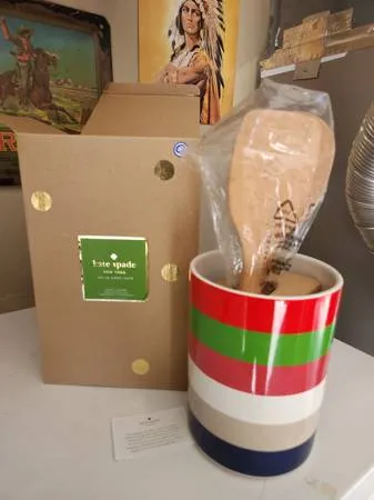 This is a Kate Spade/Lenox All in Good Taste Striped Utensil Holder with Wooden Utensils and it is Brand New and In the Original Box. The Stripes are Vibrant, Fun Colors and the Wooden Utensils are Still in Plastic. Dimensions are As Follows: 53/4 inch opening at mouth, 71/2 inches tall. PRICE IS FIRM. These Retail for More and This is Brand New with the Original Utensils Included and the Original Box and Paperwork! To View/Purchase Contact Sara @ 541-610-4633 OR Isaiah @ 541-848-8144. Call/TEXT or email Are All Good With TEXT Being Fastest and Preferred. We are Centrally Located in SE PortlandMill ParkJust 5 Minutes East of I 205 Freeway. Pick Up is Simple and We are Very Easy to Coordinate with. This Adorable Brand New Kate Spade Utensils and Holder is Priced to Sell Quickly and Will Not Last Long-Contact Us Today! NO HOLDS, LOCAL, IN PERSON, CASH ONLY SALES PLEASE!!!