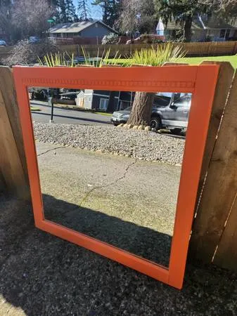 On Offer is This Simple Wood Framed Mirror and it is in Great Shape! The Mirror Glass is Perfectly Intact and the Frame is Bright Orange! It is Very Heavy and This Quality Piece Measures 42 X 42 with Frame Included in Measurements. The Frame is Wood and Has a Cool, Textured Small Square Pattern Across the Top-Very Unique and Modern. It is Vibrant OrangeNot Shiny, But Matteand Compliments Many Styles of Decor, and Really Brightens a Room. This Mirror Has Been Well Cared for and is in Excellent Condition Throughout. PRICE IS FIRM and This Substantial Piece is Priced to Sell! I Have Included Multiple Images, In Excellent Lighting, From All Angles, So You Can Clearly See the Large Square Mirror. Contact Us For an In Person/Garage Viewing Today! **Please Note ALL Viewings/Purchases Will Be in the Garage For Easy Loading** To View/Purchase Contact Sara @ 541-610-4633 OR Isaiah @ 541-848-8144. Call/TEXT or email are All Good With TEXT Being Fastest and Preferred. We are Centrally Located in SE PortlandMill ParkJust 5 Minutes East of I 205 FreewaySEE CORRECT LOCATION ON MAP. Pick Up is Simple and We are Very Easy to Coordinate with. Come Prepared It is Large and Heavy-This Great Orange Mirror is Ready to Go Today and Will Not Last Long! SORRY NO TRADES/HOLDS, SERIOUS INQUIRIES WHO INTEND TO FOLLOW THROUGH, LOCAL, IN PERSON, CASH ONLY SALES PLEASE!!!
