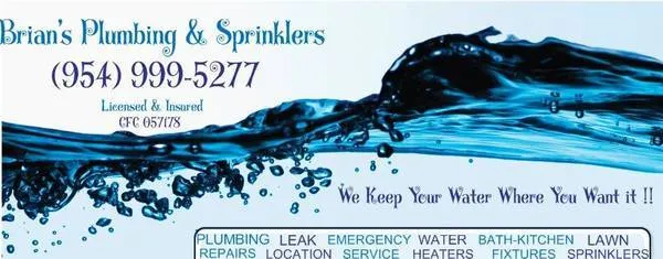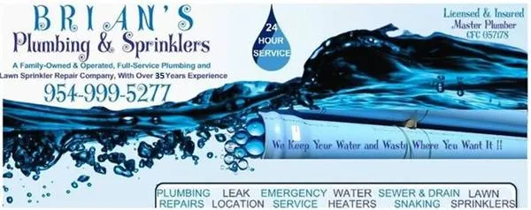 *****BRIANS PLUMBING & SPRINKLERS is a Florida, State-Certified, LICENSED & INSURED MASTER PLUMBER and LAWN SPRINKLER CONTRACTOR. WE HAVE A COMBINED EXPERIENCE OF OVER 35 YEARS, AND OFFER 24 HOUR EMERGENCY SERVICE in BROWARD, and parts of Palm Beach counties. CFC 057178 CALL FOR A FREE ESTIMATE ANY TIME: 954-999-5277 *****We service both RESIDENTIAL and COMMERCIAL customers, with PERMITS, when necessary from MINOR REPAIRS UP THROUGH NEW INSTALLATIONS. *****Our PLUMBING DIVISION is available to REPAIR, REPLACE, OR INSTALL NEW, ALL KITCHEN AND BATHROOM FIXTURES; CLEAR, CLEAN, REPAIR, REPLACE ALL SEWER AND DRAIN LINES; REPAIR AND REPLACE WATER HEATERS; We work with all insurance companies, landlords, realtors, and property managers. NO JOB TOO BIG OR TOO SMALL!!! *****Our LAWN SPRINKLER DIVISION provides services including REPAIR AND REPLACEMENT OF: PUMPS, TIME CLOCKS, CHECK VALVES, INDEXING VALVES, SOLENOID VALVES, SPRINKLER HEADS, SUCTION LINES, WATER LINES, DUCK FLOATS. We RE-ROUTE LINES for new pools, patios, landscaping, and driveways. We also DESIGN AND INSTALL NEW SPRINKLER SYSTEMS. *****We are FAMILY-OWNED & OPERATED.....FLEXIBLE AND PROMPT.....CALL ANYTIME FOR A FREE ESTIMATE!!! ************************************************************************************************************************************************************************************************** ************************************************************************************************************************************************************************************************** VISIT US ON THE WEB: www.CallBriansPlumbing 954-999-5277.com ************************************************************************************************************************************************************************************************** ************************************************************************************************************************************************************************************************** ********************YOUR 1-STOP HOME IMPROVEMENT SHOP************************* **************************************************************************************************************************************************************** WE ALSO SERVICE ALL OF BROWARD COUNTY INCLUDING: WESTON, FORT LAUDERDALE, SUNRISE, TAMARAC, PLANTATION, LAUDERHILL, DAVIE, HOLLYWOOD, PEMBROKE PINES, MIRAMAR, COOPER CITY, NORTH LAUDERDALE, LAUDERDALE LAKES, CORAL SPRINGS, PARKLAND, COCONUT CREEK, DEERFIELD BEACH, POMPANO BEACH, LIGHTHOUSE POINT, HILLSBORO BEACH, OAKLAND PARK, WILTON MANORS, MARGATE, LAUDERDALE BY THE SEA, SOUTHWEST RANCHES, HALLANDALE BEACH, DANIA BEACH, FLORIDA, FL. IN PALM BEACH WE SERVICE BOCA AND DELRAY.