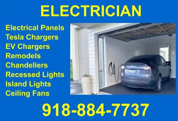I am an affordable electrician who is licensed and insured. I have 10 years of electricians installation experience. I do it all. Ceiling fans installed, electric service panel box upgrades, Tesla Chargers, Electric Vehicle Chargers, EV Chargers, plugs, outlets, switches, back up generators, track lighting, renovations of any kind, servicing, and much more! All work is d 1 to local and state codes. Call me today and I can help you with any type of electrical work you need d 1. Call me today at 918-884-7737