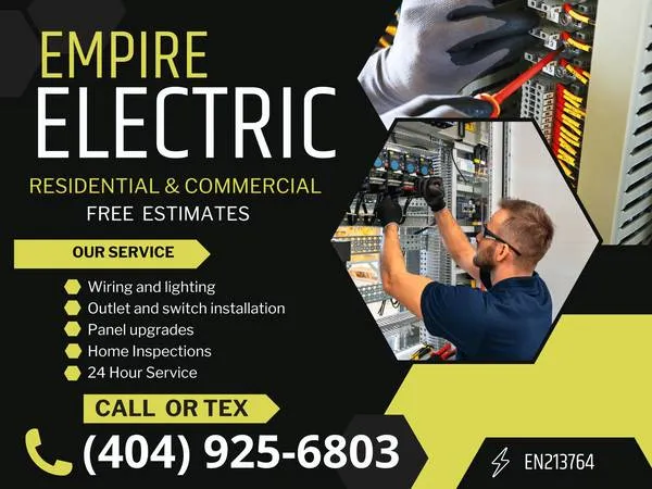 Empire Electric Residential &Commercial Call 📱 or Text💬 404-925-6803 ⭐Full Service Electrical Contractor ⭐We Service Atlanta and All Areas ⭐We do Everything Electrical for your Home and Business Some of our services: ⭐Panel Changes ⭐Service Upgrades ⭐Lighting/Can Lights ⭐New Construction ⭐Remodels ⭐LED Lighting ⭐High Ceiling Work ⭐Rewiring ⭐Outdoor Electrical Work ⭐And much more Empire Electric ATL LLC License# EN 213764 Residential &Commercial Call 📱 or Text💬 404-925-6803 Call 📱 or Text💬 404-925-6803 Call 📱 or Text💬 404-925-6803 _________________________________________________________________________________________________ _________________________________________________________________________________________________ _________________________________________________________________________________________________ _________________________________________________________________________________________________ _________________________________________________________________________________________________ _________________________________________________________________________________________________ _________________________________________________________________________________________________ _________________________________________________________________________________________________ _________________________________________________________________________________________________ _________________________________________________________________________________________________ _________________________________________________________________________________________________ _________________________________________________________________________________________________ _________________________________________________________________________________________________ _________________________________________________________________________________________________ _________________________________________________________________________________________________ _________________________________________________________________________________________________ _________________________________________________________________________________________________ _________________________________________________________________________________________________ _________________________________________________________________________________________________ _________________________________________________________________________________________________ _________________________________________________________________________________________________ _________________________________________________________________________________________________ _________________________________________________________________________________________________ _________________________________________________________________________________________________ _________________________________________________________________________________________________ _________________________________________________________________________________________________ _________________________________________________________________________________________________ _________________________________________________________________________________________________ _________________________________________________________________________________________________ _________________________________________________________________________________________________ _________________________________________________________________________________________________ _________________________________________________________________________________________________ _________________________________________________________________________________________________ _________________________________________________________________________________________________ _________________________________________________________________________________________________ _________________________________________________________________________________________________ _________________________________________________________________________________________________ _________________________________________________________________________________________________ _________________________________________________________________________________________________ _________________________________________________________________________________________________ _________________________________________________________________________________________________ Keywords: Master Electrician, Licensed Electrician, Electrical, License Electrician, Journeyman Electrician, Electricians, Electrican, electri, electrician, electrican FULTON Alpharetta Ansley Park Atlanta Atlantic Station Buckhead Cabbagetown Candler Park Castleberry Hill Chattahoochee Hills College Park Downtown Druid Hills East Point Fairburn Grant Park Hapeville Inman Park Johns Creek Little 5 Points Midtown Milton Mountain Park Old 4 th Ward Palmetto Poncey-Highland Roswell Sandy Springs Union City Virginia-Highland North Counties & Cities CHEROKEE Ball Ground Canton Holly Springs Waleska Woodstock FORSYTH Cumming GILMER East Ellijay Ellijay Northeast Counties & Cities DEKALB Avondale Estates Brookhaven Candler Park Chamblee Clarkston Decatur Doraville Dunwoody East Atlanta Edgewood Kirkwood Lithonia Pine Lake St 1 Mountain GWINNETT Auburn Berkeley Lake Buford Dacula Duluth Grayson Lawrenceville Lilburn Loganville Norcross Peachtree Corners Snellville Sugar Hill Suwanee HALL Braselton Buford Clermont Flowery Branch Gainesville Gillsville Lula Oakwood WALTON Loganville Monroe Social Circle Northwest Counties & Cities BARTOW Adairsville Cartersville Emerson Euharlee Kingston Taylorsville White COBB Acworth Austell Cumberland Kennesaw Mableton Marietta Powder Springs Smyrna Vinings PAULDING Braswell Dallas Hiram South Counties & Cities CLAYTON Forest Park J 1 sboro Lake C