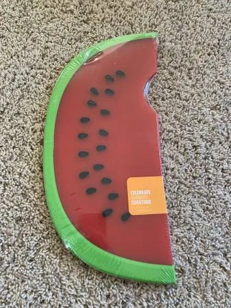 Watermelon Cutting Board - New! by Celebrate Summer Together PRODUCT FEATURES Non-slip grip provides stability and safety during cutting Gentle on blades, wont dull knives Reversible design Ideal for cutting and serving Plastic Dishwasher Safe Measures 15 x 6.5 Brand New! Factory Sealed, Unopened, Undamaged! Text me at 720-432-5337 Cash only please. Porch pick up in Broomfield, or able to meet in most areas between Highlands Ranch and Estes...
