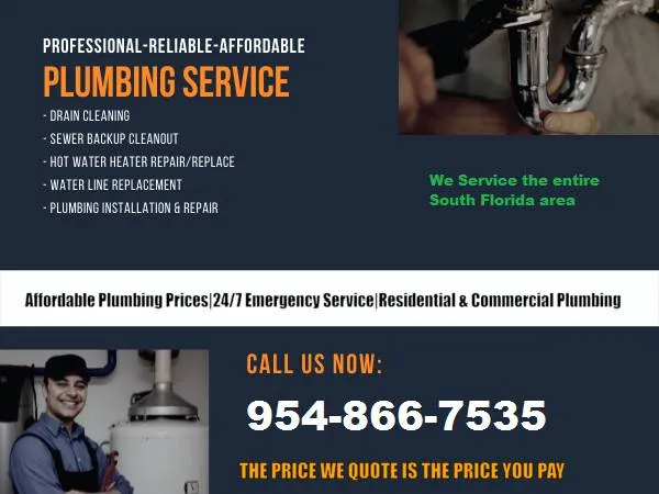 South Florida Professional Plumbing Service you can trust and Rely on. -Plumbing Repair and Installation D 1 Right the First Time -Fully Written Estimates-No Hidden Fees -Proudly Serving the Entire South Florida Area Including Broward - Miami Dade - Palm Beach Counties -24/7 Emergency Plumbing Repairs -Both Residential and Commercial Plumbing Services ☎️ Call us today for reliable & affordable Plumbing Service @ 954-866-7535 We are available 24/7 with same day plumbing Service available Below are the many plumbing services we provide Septic System Tank Repair Toilet Replace and Repair Water Heater installation & Repair Toilet Repair/Install Regulator Garbage Disposal Installation Tankless Water Heater System Water Heater Installation Installation of gas shut Gas Leak Detecting and Repaired Toilet & urinal repair or replacement Copper Repipe and Repair Sewage system Bathroom Sink Rooting Rooter Drain cleaning Hot Water Recirculation System Water heater repair or replacement Garbage disposal repair or replacement Leaky Faucet Water Heater installation & Repair Hot Water Recirculation System Full Service Plumbing and Drain Repairs, Commercial Faucet Installation Kitchen faucet repair or replacement Rooter services Appliance installations Bathtub Rooting Master plumber at affordable price water pipes Low flow toilets. Drain Clogs Hydro Jetting Service Sewer Lines Installed and Repaired Water filtration systems. Water Line Service Backflow / anti Backflow prevention find and fix leaks install faucets hot water heaters sewer lines toilet repair emergency service ☎️ Call today @ 954-866-7535 We Service the entire South Florida Area including Broward - Miami Dade - Palm Beach Counties
