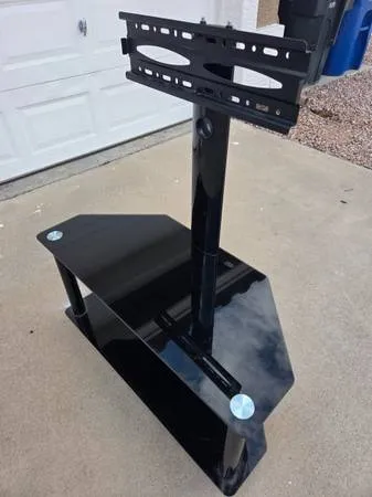 TV stand has 2 black glass shelves for all of your comp 1 nts. Black powder coated frame. It fits TVs up to 55 inches in screen size. Also has a cable management system to hide and organize wires between the TV and A/V comp 1 nts. No scratches or dents. Like new condition. 35 wide 16 deep 42 tall Retailed for $150 plus tax. 480-861-2117 Located near power and McDowell in northeast Mesa.