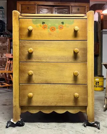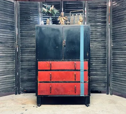 Cute old chippy Asian style dresser cabinet. Black and red with a fun teal stripe, perfect natural distressing, wear and weathering. Great hardware, lovely dovetailed drawers, sweet lil feet with casters and a nice backsplash. This cutie has been well loved and shows it. The shelf in the cabinet can be removed making it a great area to store liquor or records. The left side door locks in place with an upper and lower mechanism and the right door shuts tightly to it with a ball and groove system. It’s clean and cute and would be great in any room. Dining room to master bath. Canned goods to linens. $240 509-868-9591 291/4 W x 191/4 D x 46 T Venmo/Cash Delivery is a possibility
