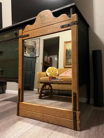 Darling circa 1930 s Monterey period, mission arts and crafts style oak framed mirror. Sweet hand painted cactus motif and attractive Iron cladding 1 missing rivet on the lower right , shown in the 8 th photo. This vintage gem is perfectly weathered with very little aging to the mirror. Appraisal included in the photos. Clean, cute, timeless. $360 509-868-9591 23 W x 37 T x 1 inch thick Venmo/Cash Delivery is a possibility