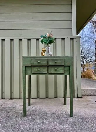 Darling old primitive cabinet. Painted in DIY Aviary green, heavily distressed and dark waxed. Flip top sides, fold back middle, twenty awesome small cubbies, 2 larger cubbies and 3 roomy drawerstop drawer looks like 2. Sewing, crafts, seeds, small glass jars full of treasures, hardware, knickknacks, nails, oddities, screws, jewelry, stickers, beads, bolts, makeup, what nots and random small items that need a place. Cute, clean, fun inside or on the front porch. $200 Normal wear with some modern updates to tighten it up. Left side flip top dips a little lower than the right. 509-868-9591 263/4 W x 181/2 D x 32 T Twenty cubbies shy of 3 x 3 x 41/4 T 2 cubbies 111/2 W x 3 D x 31/4 T Top drawer 101/2 W x 91/2 D 21/2 T Small drawers 7 W x 113/4 D x 21/2 T Venmo/Cash/Delivery is a possibility