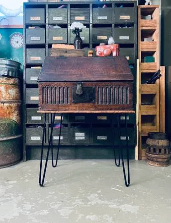 Lovely primitive antique oak table top bible box side table. Possibly from the 18 th century. Beautiful slant lid, iron hardware, carved arched colonnade motif front, 5 cute drawers, new to it beaded drawer pulls and great hairpin legs. It shows Normal wear and weathering, mostly on the front lower left corner 6 th and 7 th photos. The lock does not work and the key is long g 1. It is very easy to remove the legs if you’d prefer to have this old gem sitting on a table, desk or mantle. This is a rare piece, it is clean and so pretty. Lovely with the slant lid open or closed. I included the appraisal in the photos as well as a comp. Gorgeous antique bible box. $460 509-868-9591 211/2 W x 141/4 D lid closed 19 D lid open x 31 T Venmo/Cash Delivery is a possibility