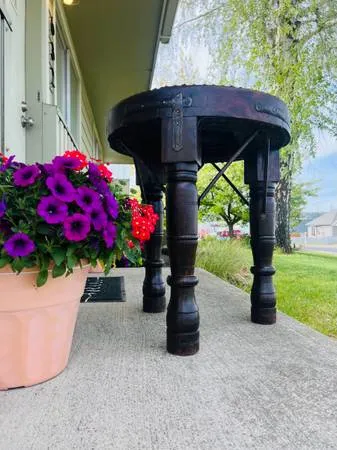 Gorgeous circa 1900 Ind 1 sian Bullock cart wheel repurposed into an incredible side/parlor/cocktail/accent table. Beautiful coloring and detail. Rustic, industrial, primitive, mid evil, gothic, farmhouse or MCM, it will blend in with any style and leave a lasting impression. It is built to last forever with the lovely metal bands, straps and leg supports. It is a stunning vintage piece and would look great between 2 old weathered and worn leather chairs. Home. Cabin. Law Firm. Retail Setting. Waiting Room. Office. Den. Library. $800 509-868-9591 231/2 x 231/2 x 27 T I am in CDA weekly and Sandpoint every couple of weeks. Venmo/Cash Delivery is a possibility