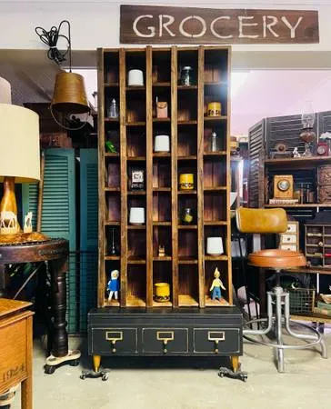 Awesome card catalog cubby shelf. I attached my old rustic primitive cubby to my vintage card catalog, I added side brackets and a wood support in the back to keep the cubby in place and I gave the card catalog a quick black paint job, a good distressing and added some cute MCM feet. This rustic industrial gem is perfect for wine, oddities, liquor, petite bookstaller 1 s on their side, collectibles, mugs, old photos, paint, glassware, memorabilia, post cards, candles, pretty much anything and everything small. It is clean and cool with perfect weathering and wear. $600 509-868-9591 Venmo/Cash/Facebook Pay Delivery can be discussed. 33 W x 17 D x 73 TCubby is 9 deepThe cubbies range from 31/2 to 51/4 inches in width x 8 inches in depth and they range from 71/4 to 9 inches in h 8. Awesome repurposed piece.