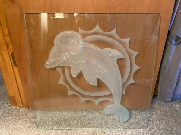 Custom Miami Dolphins glass art. Measures 24 x 24, 3/8 thick tempered glass with a finished pencil edge. This design is of the old Dolphins helmet and is carved and etched into the back of the glass. 1 of a kind custom made piece. Very cool item for a collector or in your mancave........$220......... call 321-205-6492
