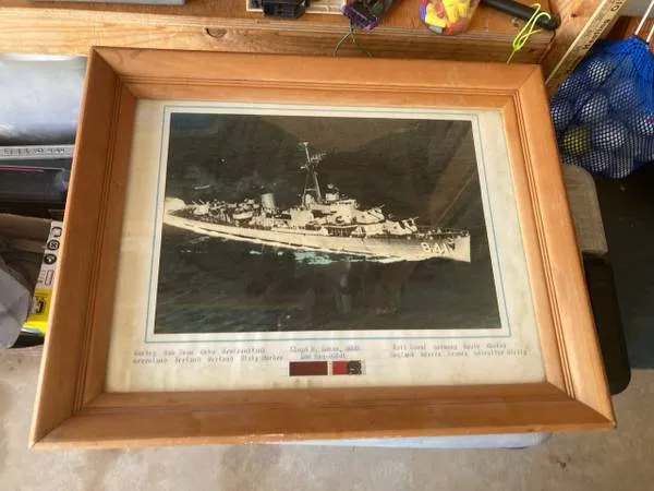 I bought this at an estate sale.....USS Noa D-841 wood framed picture. This was a US Navy Destroyer commissi 1 d in WW 2. Measures 15 x 19. Fair to good condition, The Sailors name in the legend of the pic is Lloyd N. CowanIf you are a family member of this Sailor or a family member of a Sailor who was on this ship call me and I will gladly let you have this for no charge and with much respect............$20........ call 321-205-6492
