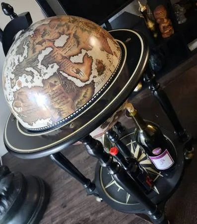 Holds wine bottles, aIcohoI bottles, Glasswater, ice buckets, etc. Has wheels and can be used as just decorative. Globe is approx. 16 Diameter Measures: 36.5 inches high x 22.5 inches wide x 22.5 inches deep Like new condition. Had for about 8 months and changing home decor now. I live in East Austin. Contact Tea: 512-743-4030 $100 FIRM. CASH OR CASHIER CHECK. NO TRADES. NO DELIVERY.😎