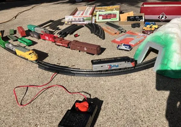 This set was originally based on the Bachmann Challenger set 00621 which included a yellow Union Pacific engine, a matching caboose, and 2 cars. It now has many more cars, a second powered engine, much more track, and other accessories. Both engines work. Comes with power pack and connection to track. The power pack allows variable low positive or negative voltage to be applied to make the locomotive move forward or backward at variable speeds. All of the original 3 carsincluding the yellow caboosethat came with the set have horn hook couplers. The set now also has an additionalbrowncaboose. There are a total of 9 complete, working cars that have couplers on both sides, including the 2 cabooses. 8 of these use horn hook couplers, the 9 th is a newer coal car and uses knuckle couplers, but I found that its knuckle couplers can hook to the horn hook couplers on the other cars in this set. There are 2 additional cars that are complete except for a missing coupler on 1 end, so they could be used as they are as the last car on a train hooking on 1 end, or the missing couplers could be replaced. The yellow Union Pacific engine has a horn hook coupler, but the Amtrak engine is missing its coupler. I believe the Amtrak engine is an Athearn 42005. Replacement couplers can be obtained online or at a model railroad show / flea market or hobby store very inexpensively. I believe the Amtrak engine is an Athearn 42005. I can set up a short segment of track to show you that both locomotive engines work. You can also see all the cars, track, and accessories. Text or call 682-503-1757 or reply by email.