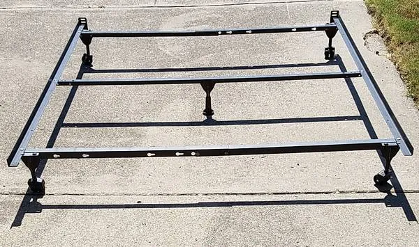 Queen sized metal bed frame with cross arm for center support. Wheels on 1 end can be locked to prevent movement. Very good condition. Frame can also be adjusted to 2 smaller sizes. Text or call 682-503-1757 or reply by email.