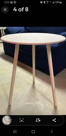 2 matching 23 Inch screw in 3 legged circular particle wood tables with glass tops and ivory linen skirts. $30 EACH. Cash. From a smoke free home. Located near Deale, MD 410-271-5854