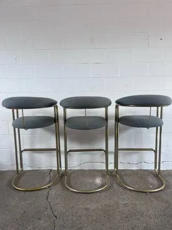 Hi there! 3 very cool 1990 s brass industrial restaurant barstools with the original beautiful blue restaurant-grade fabric. The brass has some patina and the fabric is in great condition, wear is consistent with age and use. 42 t x 25 w x 21 d seat 32 t $130 each or $350 for all 3 Delivery a possibility in the Portland Metro area with a nominal agreed upon fee 😊. I work in PDX 503-887-1832 or 503-231-3357