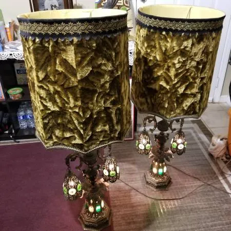 PAIR OF LOEVSKI & LOEVSKI LAMPS FROM 1940 S / HOLLYWOOD REGENCY BRASS . 3 WAY & 4 WAY LIGHTING . ORIGINAL L& L SHADE NO FLAWS . LAMPS WITH SHADES ON MEASURE 46 INCHES. PICTURES DO NOT REFLECT TRUE DEEP COLORS , LOOKS MUCH BETTER IN PERSON ! I WILL NOT RESPOND TO EMAILS OR TEXT ! YOU CAN CALL ME AT 912-433-6924............GARY