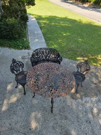 OUTDOOR FURNITURE SET FROM LATE 1800 S . SOLID IRON ! NO CAST METAL , ALUMINUM , FORGED METAL OF FORIEGN DECENT ! A PAINT JOB WOULDNT HURT. ..........VERY HEAVY / VERY STURDY . CALLS ONLY PLEASE , THANK YOU . 912-433-6924 GARY