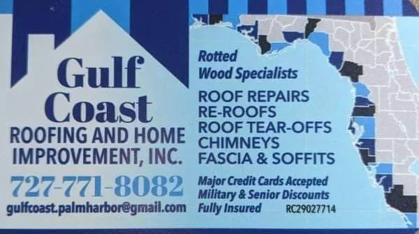 Gulf Coast Roofing and Home Improvement Family Owned and Operated We offer Free Estimates All major Credit Cards Accepted Financing Available Senior and Military Discounts 24/7 Emergency Calls and Tarping We Speak Fluent English and Spanish We are a Full-Service Roofing Company, who Specializes in rotted wood, chimney repairs, fascia and soffit. We also offer home improvements. *Tear off/Reroof of entire roof includes a FREE Mitigation Inspection. We are Fully Licensed and Insured. References available upon request. Now serving all Counties in the State of Florida Please feel free to call my office at 727-771-8082. Thank you Jess and Carlos Owners Keywords: Roofer Roofers Roof Roofing Tiles Shingles Rotted Wood Roof Replacement New Roof Chimney Soffit Facia Tarp Tarps Tarping Metal Tear Off Repair Repairs Storm Hurricane Cleanup Debris Hauling Trailers