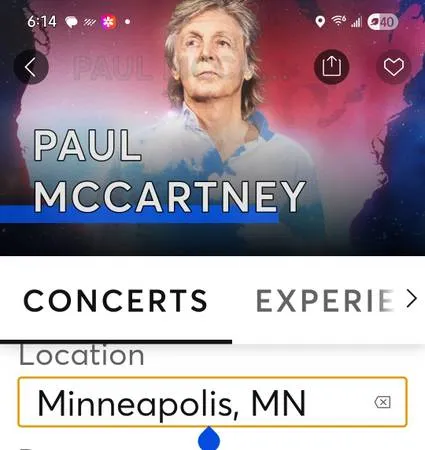 bought tickets to see Paul McCartney in his new tour in Minneapolis, next Friday 10/17/25. I bought 4 tickets, and one person cannot use their ticket. I am simply looking to get back what I paid for this ticket, $100. It can be electronically transferred to you from my Ticketmaster account, without fees. The ticket is in section 118, Row 38 seat 11. Its in the first above floor level, with a clear view of the stage and huge video screens. If you are interested in the ticket please let
