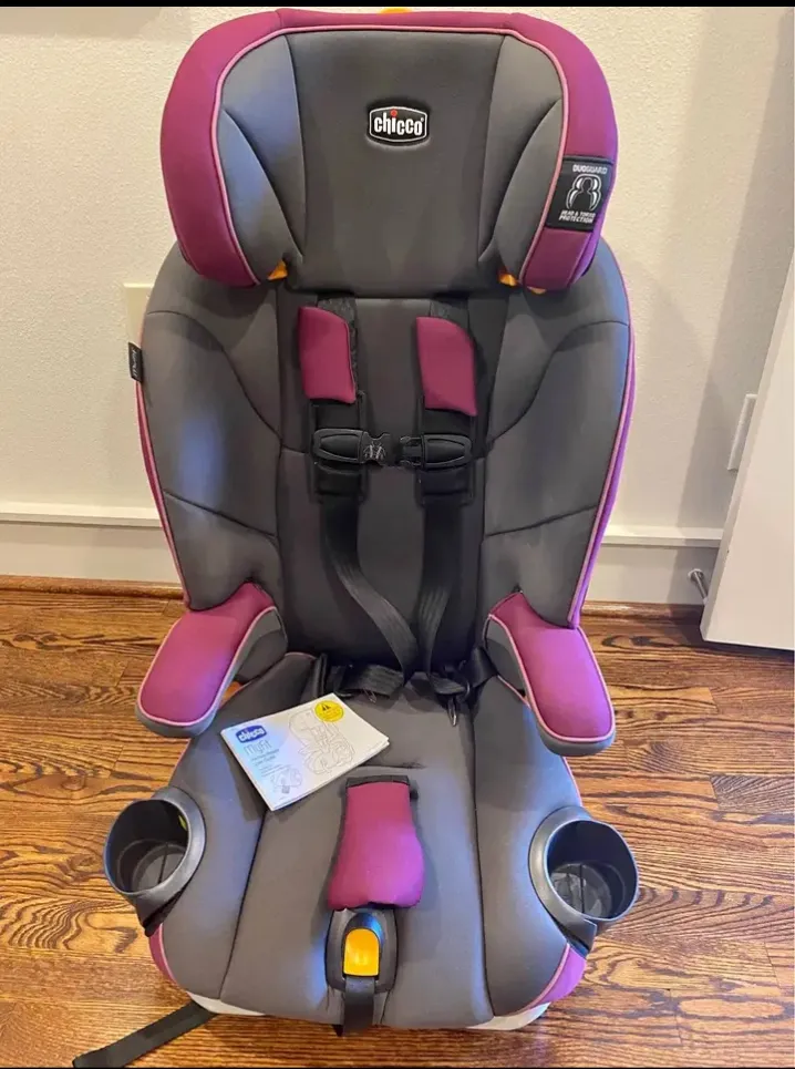This is a Chicco DuoGuard child car seat in excellent condition. The seat features a stylish gray and purple color scheme and comes with dual cup holders and side impact protection. Padded seat, armrests, and adjustable harness offer comfort and security for your child. Instruction manual is included. Minimal signs of wear, clean, and well maintained. Suitable for multiple age groups with easy installation in most vehicles.
