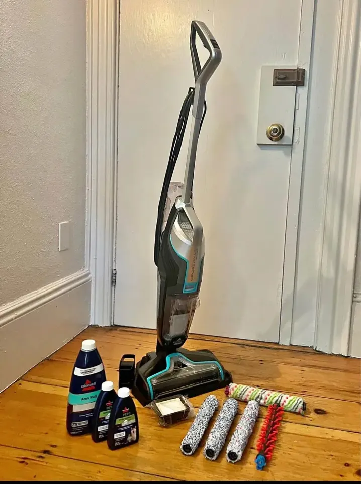 Bissell CrossWave Pet Pro – vacuums & washes floors in one pass. Used 3x, like new. Includes: Unit + original box 3 full detergents (Pet, Multi-Surface, Wood) 4 brush rolls (2 installed, 1 sealed new, 1 rug) Extra filter