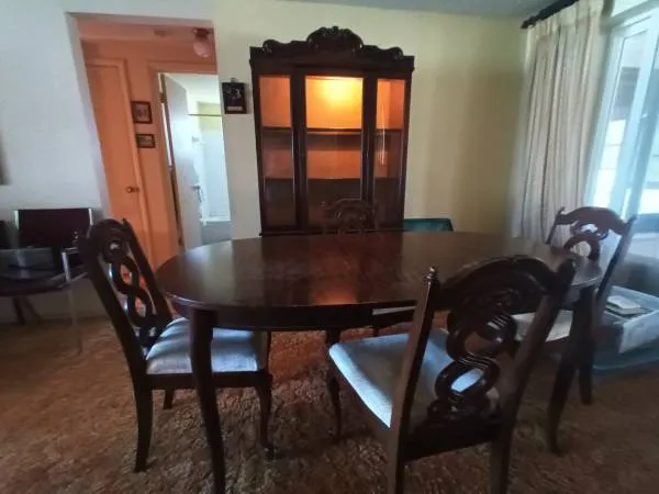 If you are reading this then the item is still available. Please call Steve 727-254-0280. Dining table with chairs, some chairs need attentionre-enforce or replace wood backing that split.