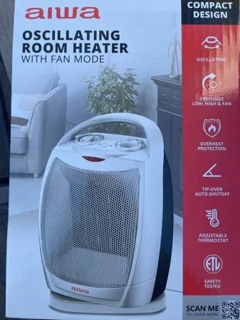 2 AVAILABLE!! $30 Each please 707-787-0044 Id be willing to deliver locally! The AIWA Oscillating Room Heater is perfect for to add warmth to any 200 Sq feet room! This ceramic heater is manufactured for indoor-use only and features 3 different heat settings: FAN/750 W/1500 W. The AIWA 1500 W Oscillating Room Heater warms up quickly to your desired setting and keeps you warm! With the AIWA 1500 W Oscillating Room Heater fan only mode and adjustable thermostat - this is the perfect heater for ...