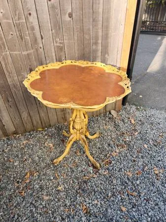 Beautiful antique vintage carved wood rococo baroque ornate occasional table late 19th century or 20th century This is a beautiful little decorative end or corner or occasional table. Perfect as an accent piece, near an entryway or has a visual accent anywhere you might want it. Because it is so distinct, it can go with many different decors from a boho eclectic mix, or with fairly conventional as a little unique accent, or in a period decor, or eclectic mix, maximalist, grand millennial, or if you win the lottery and buy a palace in France or build one in Paris Texas if you so choose. Im not sure of the age of this beautiful piece. The style is 17 or 18th century French rococo or something like that. There have been various revivals such as in the mid to late 19th century, but also in the mid-20th century, and there probably are numerous examples of this type of thing being made in between. But I really dont know the exact age. It certainly not new or made in China or anything like that as far as I can tell. I believe it is all wood with a burl veneer on top. Given its age, its obviously not perfect and you wouldnt want it to be. It has some scuffs and chips here and there. But it is solid and sturdy and very well made and in quite good condition. It had a broken leg which I repaired with some high quality wood glue and typically that holds better than the actual wood, so Im not too concerned about it holding up. It should be fine. The glue seems to have lightened the paint a little bit right by the break and you can see that in a couple of photos. But it barely shows and I dont think it will be noticeable when used. Measurements are in the photos. Let me know if you have any questions. Available in Northeast Seattle. Delivery could be possible around Seattle for free or a reasonable charge.