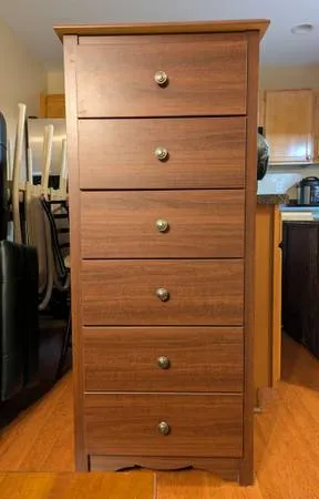 Almost new condition. This beautiful and modern 6 drawer lingerie chest is detailed with curved top edges, side moldings, a scalloped base panel and solid dark pewter knobs. Drawers run smoothly on metal Glides with built-in safety stops. Made from durable non-toxic laminated composite woods with a sturdy back panel. Delivery available if needed. Text me thanks. Dimension: 23.5W. 28D. 53.5H