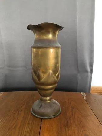 Vase made from artillery shell. Probably from WWII. Brass artillery shell casing. 12 inches high. 5 inch diameter. Contact 812-606-0572. It is up to the buyer if he wants to keep the patina like it is or polish it.