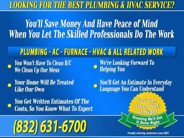 Call 832-631-6700 Were a service that has divisions in Plumbing and HVAC and Proudly Serving Houston and Surrounding Area Choose Your Repair/Service Company Wisely - If You Hire the Wrong Company, You Could Have Dramatically Higher Costs and Future Problems Because They Didnt Fix the Problem Right the First Time... We Know Because Were the Company People Call To Clean Up Bad Jobs In Our Work We Have Pride -Quality Is What We Provide Easy To Understand Estimates High Quality Craftsmenship Dedicated and Devoted Call Now To Experience The High Quality Repair And Replacement Service Were Known For Our team of highly trained contractors has what it takes to get a job d 1 right. No matter how big or small your project may be, our team can help you to put everything in place Our business has satisfied numerous clients when it comes to their need for any and all home repairs and installations, no matter the size of the job, no job too big or too small. We help you achieve satisfaction through the services we provide. Whatever you need, we can help you with. Our contractors are rated 1 by most services and treat your home as if it were their own. Call 832-631-6700 Plumbing Plumbers Appliance installations Water Heater Installation Garbage disposal repair or replacement Kitchen Sink Kitchen faucet repair or replacement Sewage system Water heater repair or replacement Faucet Installation Faucet pressure Drain Clogs Rooter Water Heater installation & Repair Pipe Installation Toilet & urinal repair or replacement Bathtub Rooting Water Heater installation & Repair Hydro Jetting Service Garbage Disposal Installation Hot Water Recirculation System Full Service Plumbing and Drain Repairs, Commercial Rooter services Gas Leak Detecting and Repaired Low flow toilets. Drain cleaning Backflow prevention Water Line Service Leaky Faucet Plummer Tankless Water Heater System Toilet Repair/Install Toilet Installation Toilet Replace and Repair Drain Cleaning Installation of gas shut Copper Repipe and Repair Water filtration systems. Backflow / anti Hot Water Recirculation System Master plumber at affordable price water pipes Regulator Garbage Disposal Installation / Repair Bathroom Sink Rooting Drain Cleaning and Unclogging Sewer Lines Installed and Repaired Leak Detection Electric Trouble Shooting and Expert Repairs New Homes/Additions/Remodel Experts Custom Lighting Design Recessed Can Lighting Security Lighting / Landscape Accent Lighting Design Ceiling Fans/Exaust Fans/Attic Fans Electrical Services and Electrical Service UpgradesFuses and Circuit Breakers Code Correction/Code Compliance Repairs Electrical Safety Analysis Smoke Detectors / Carbon Monoxide GFCI Protection ARC Fault Protection Low Voltage Wiring Air Conditioning and Electric Heat Any Appliances / Water Heaters / Dryers / Ranges / Microwaves Hot Tubs / Jacuzzi Tubs Emergency Generators Electrical Roof and Gutter De-Icing Cable Trouble Shooting New and Old home repair specialists Storm Damage Service Equipment Repair Upgrade services fuse boxes to circuit breakers Code compliance/illegal and unsafe wiring Overloaded circuits Branch circuit faultstripped breaker/blown fuse Devices and light fixturesreceptacles, switches, GFCIs Underground wiring phone and cable TV All appliance circuitsranges water heaters, dryer, microwave, dishwasherCEILING LIGHTING Chandeliers Mini Chandeliers Flush Mounts Pendants Fluorescent Lighting Track Lighting Mini Pendants Semi Flush Mounts Recessed Lighting Island Lighting Billiard Lighting Lighting Accessories, Ceiling fans and exhaust fans attic fans Trouble Shooting and Expert Repairs New Homes/Additions/Remodel Experts Custom Lighting Design Recessed Can Lighting Security Lighting / Landscape Accent Lighting Design, Ceiling Fans, New installs , Replacing Wall switch, Remote control Ceiling Fans/Exhaust Fans/Attic Fans, Lighting, Recessed Lights installed 456, Chandeliers, Scants, Dimmers, Spotlights, Security Lights, Motion sensors, under the counter lights, accent lights. Surge Protection Dimmers Gfci & Arc Fault Protection Solar panels Underground Services Electrical Work Hot Tub Or Jacuzzi Wiring Electric heater Emergency Electrical Services Electricians Outdoor Lighting New Construction Install Lights Dryer & Oven Outlets Code Corrections Generator Installation Interior Lighting Electrican Residential Electrician Ceiling And Attic Fans Lighting For Fixtures Master Electrician Motion Sensor Lights Pool & Spa Wiring Indoor And Outdoor Lighting Light Switch Computer Circuits Smoke And C 02 Detectors Switch And Outlet Repair Dusk To Dawn Lighting Accent Lighting Doorbells Service Upgrades/Repairs Under Cabinet Lighting Lighting Installation Remodels Wiring Indoor Lighting Light Fixtures Solar Panel Installation Trouble Shooting Electrical Lighting In-Floor Heating Ceiling Fans Fan Installation Smoke Detectors Electrical Contractor Recessed Lighting Room Additions Hvac Wiring HVAC boiler boilers HVAC Systems Heating Heater Furnace repair Install HVAC Gas Heaters Installer Electric furnace replacement Air Conditi 1 r Repair Air Conditioning Install Air Condition Installation Roofing - New Roof Shingles Siding Local Roofing Company Asphalt Roofing Flat Roofs Industrial Roofing Roof Inspection Commercial Roofers Windows Siding Repair Asphalt Roll Roofing Metal Roof Storm Damage Home Roofing Roofers Roofing Repair Metal Roofing Roofing Contractors Roofing Wood fences Exterior Window Replacement Roofing contractor Certified Roofing Roof Replacement Wood decks Roofer Roof Repair Roofing Service Roofing Services Window Installation Reroofing Re Roof Wood Shingle Hail Damage Window Repair Gutter Install Gutters Gutter Cleaning Gutter Installation Seamless Gutters Painting Interior House Painters House painting House Painting Companies Painting contractors House painters Outside House Painting Interior Home Painting Home Painters Painting Paint Stripping Interior Painting Exterior Painting Service House Painter Paint Removal E