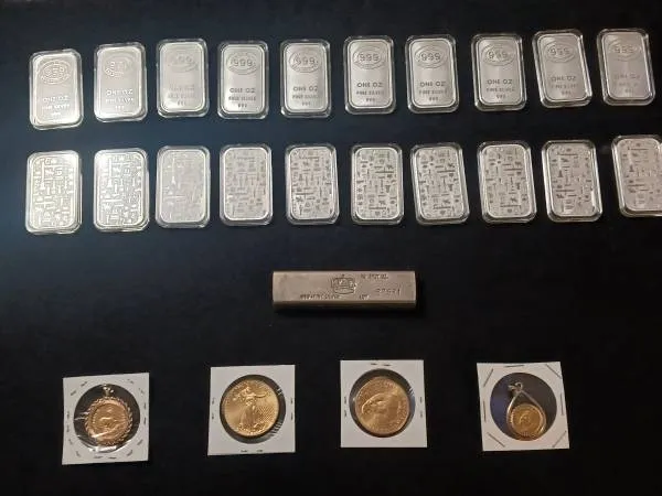 Hi I am putting up for barter my gold and silver coin collection I have 21 oz 2023 Gold American Eagle coins a 199010 th ounce gold panda with a 14 k gold bezel and a 1973 South American gold coin with a 14 k gold bezel also included is 201 oz silver bars and a 10 oz silver bar so almost 3 oz of gold total and 30 oz of silver look into barter for classic car or truck open to all trade offers possible Harley for more information text Pat at 619-277-7451 thanks for looking have a great day