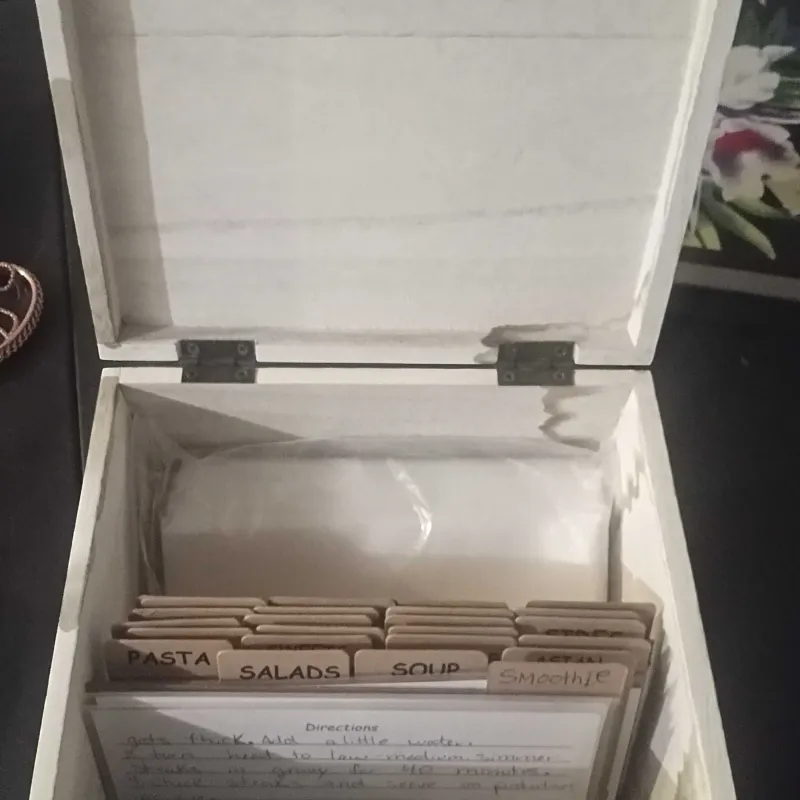 I'm selling a recipe box where u can put and write all your recipes in CASH ONLY PLEASE never been used except only 3 papers out of it for 3 recipes but that was it
