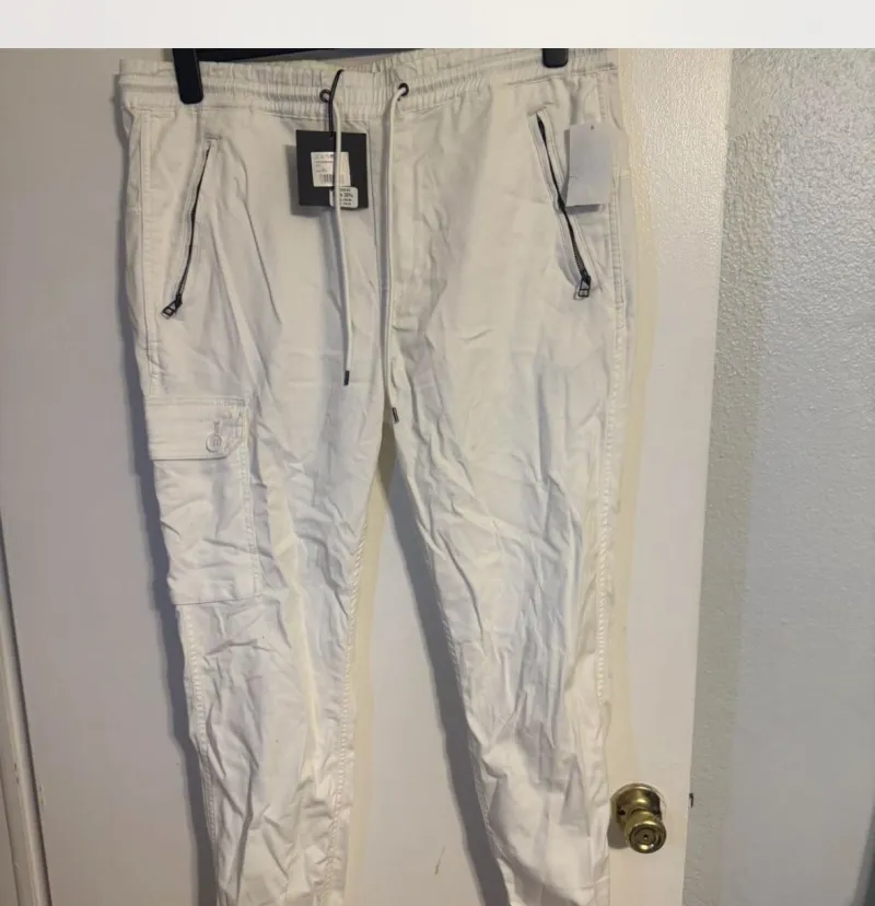 Stylish white cargo pants with multiple pockets. Perfect for casual wear. Comfortable fit.