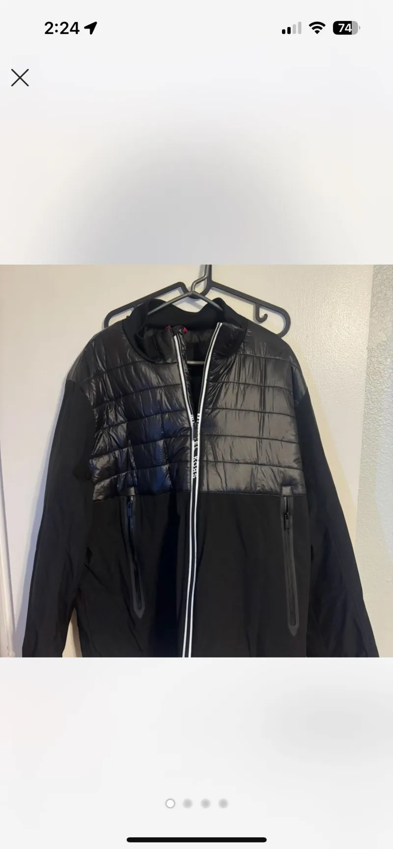 Stylish black puffer jacket with sleek design. Features zip closure and side pockets. Ideal for cold weather.