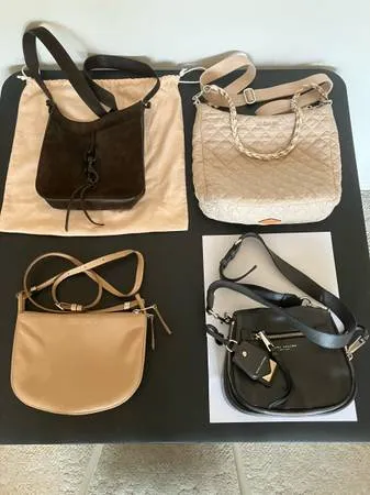 44 different, 3 genuine leather and 1 quilted Designer Shoulder/Saddle/Hobo bags: 1. REBECCA MINKOFF, model 134-2107, smoothest brown genuine suede leather Hobo bag with black t 1 d metal hardware. 1 snap exterior compartment, and 2 interior sections. 9 W x 9 H x 3 D, accompanied with 16 x 16 soft fabric dust/storage bag. LIKE NEW, used only 2 times. Upper left picture. $105. 2. Mz WALLACE, quilted beige nylon Sling Bag with chrome hardware and additional interior zippered and detachable makeup bag. Bag is lined and has a variety of straps, a rope like chain strap and a shoulder strap. Has 3 external zip compartments and 5 interior slip pockets and a zip pocket. 12 W x 12 H x 4 D, in VERY GOOD CONDITION. Upper right picture. $70. 3. MARC JACOBS, model M 001-607-0249, beige genuine leather shoulder bag. 10 W x 7 H x 2 D with 2 zippered compartments. EXCELLENT CONDITION. Lower left picture. $80. 4. MARC JACOBS, model M 0008137074, chrome hardware, shoulder/saddle bag, dk gray/brown. Exterior zip compartment and slip pocket. Interior zip compartment, zip pocket and 2 slip pockets. Genuine leather and lined. 9 W x 9 H x 4 D with adjustable strap. Used only a few occasions and in LIKE NEW CONDITION. Original purchase price was $375 plus tax. Lower right picture. Selling for $135. ***REDUCED*** PRICED TO SELL. Purchase more than 1 at these crazy low prices.